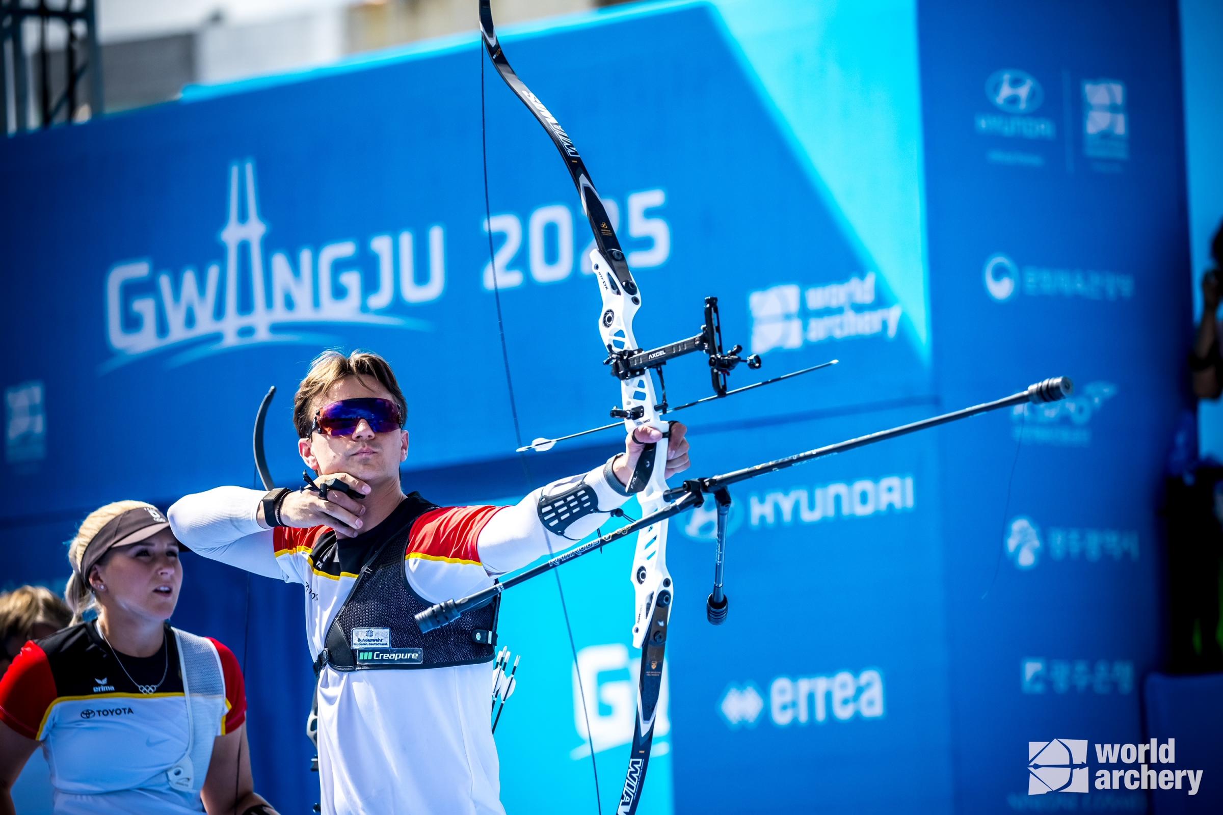 Hoch motiviert und gut vorbereitet stellten sich heimische Bogenschützen bei der Weltmeisterschaft im Bogensport Mekka Gwangju / Südkorea der Konkurrenz. Vor den Teamwettbewerben stand zunächst die Qualifikation für jeden der insgesamt 277 (154 Männer und 123 Frauen) Teilnehmer an. Trotz strömenden Regen schossen hier drei DSB-Athleten stark und konnten sich im Vorderfeld platzieren, darunter die FSG-Schützen Katharina Bauer (664 Ringe, 19. Platz) und Moritz Wieser (673 Ringe, 25. Platz) sowie Mathias Kramer (672 Ringe, 30. Platz) überzeugten mit guten Leistungen und platzierten sich im vorderen Viertel.